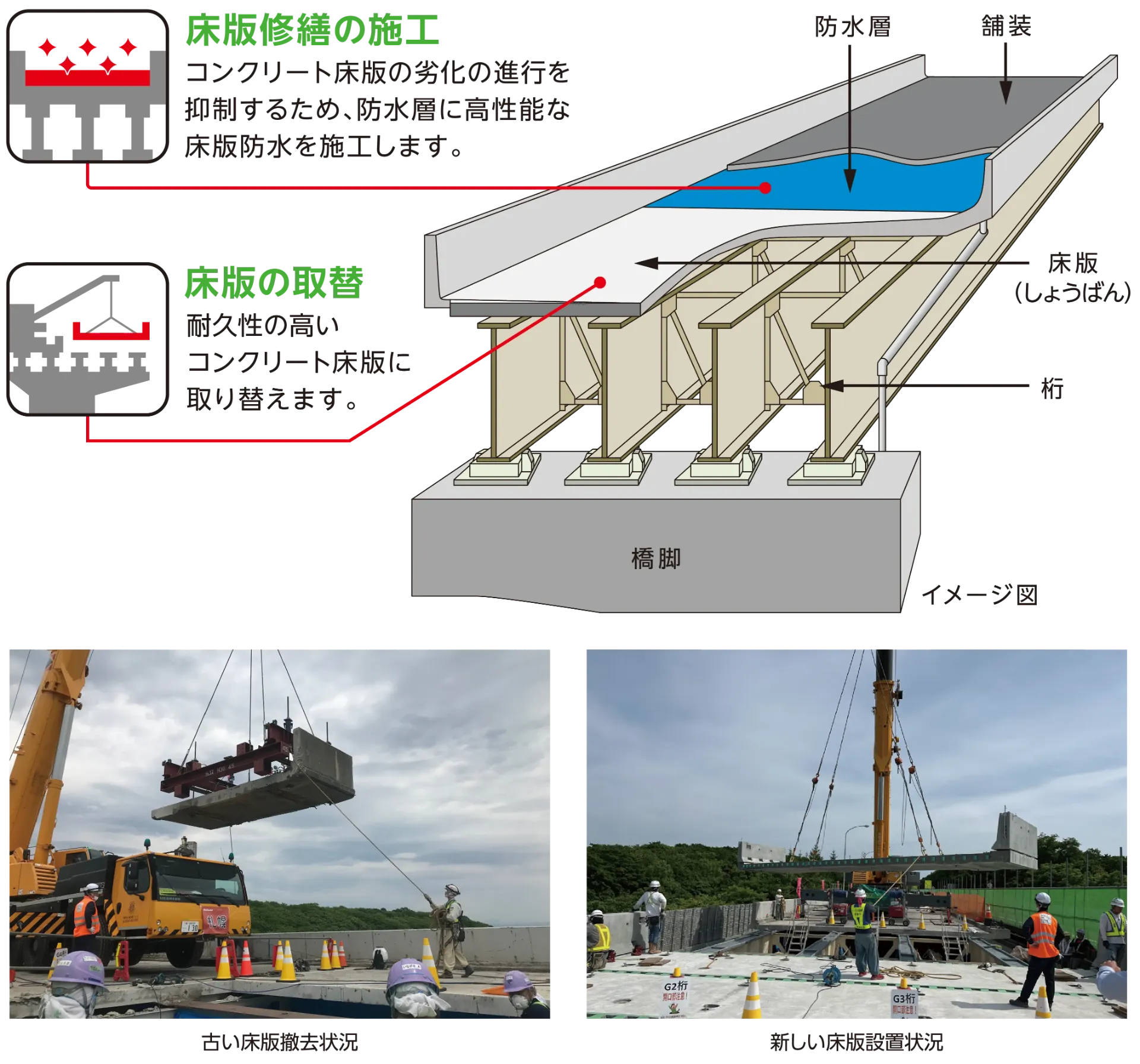 劣化した既設のコンクリート床版を、新しい床版に取り替えることにより安全・快適にご利用いただける高速道路に生まれ変わります。