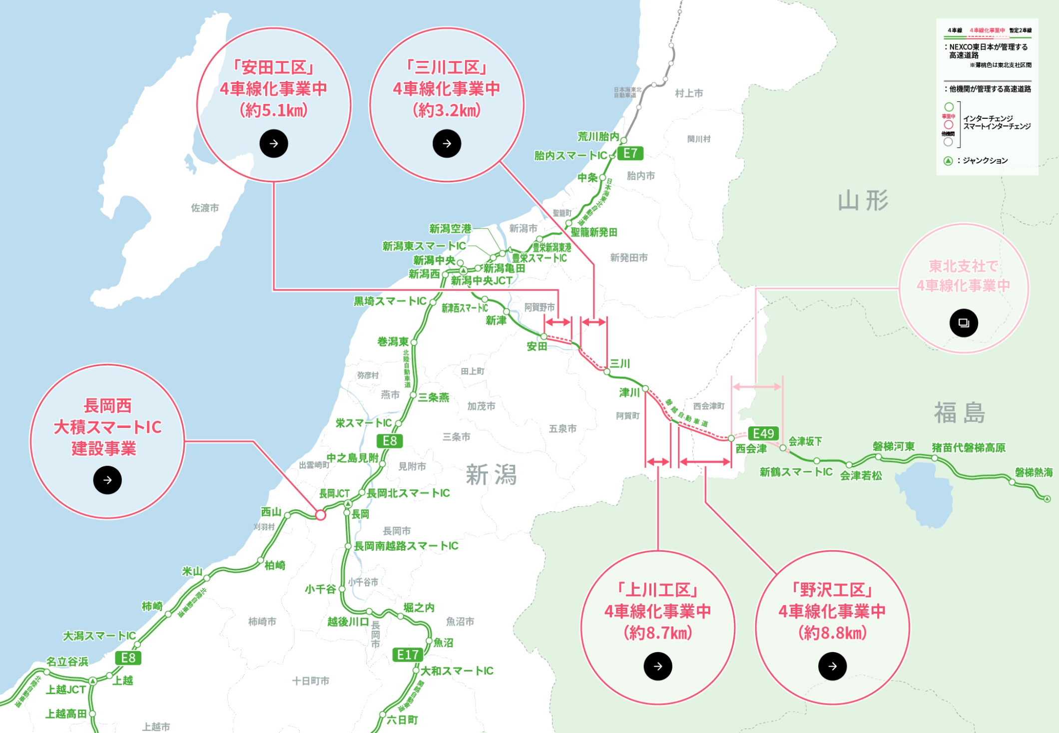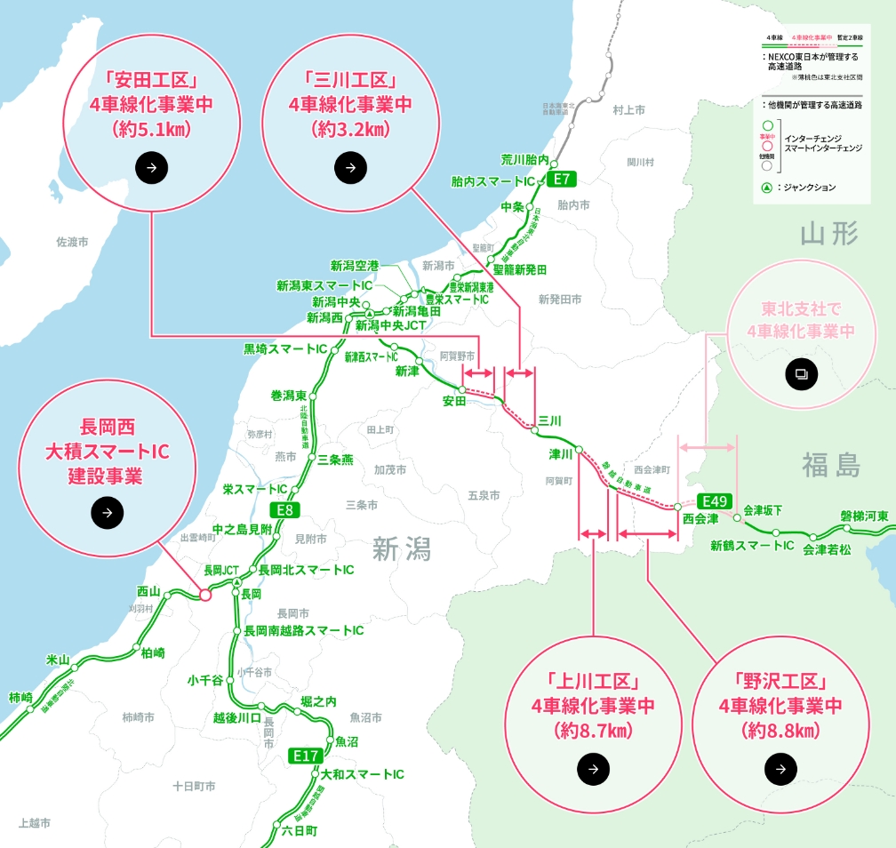 新潟エリア 建設事業マップ 4車線化 工事進捗状況 磐越道 安田工区(三川IC~安田IC) 磐越道 三川工区(三川IC~安田IC) 磐越道 上川工区(西会津IC~津川IC) 磐越道 野沢工区(西会津IC~津川IC) スマートIC 工事進捗状況 長岡西大積スマートIC HOME 新潟エリア 建設事業マップ