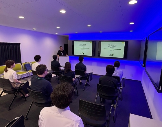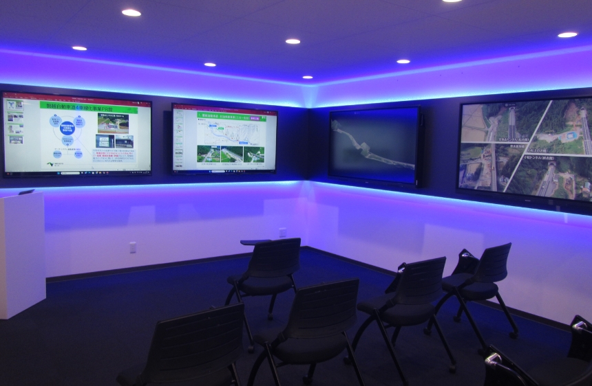 4車線化事業などの取り組みをわかりやすく紹介する 「レクチャールーム」。 若手社員を中心に、近未来の建設現場における働き方をディスカッション する場で、リモートワークを現場に取り入れる実証にも使用可能です。