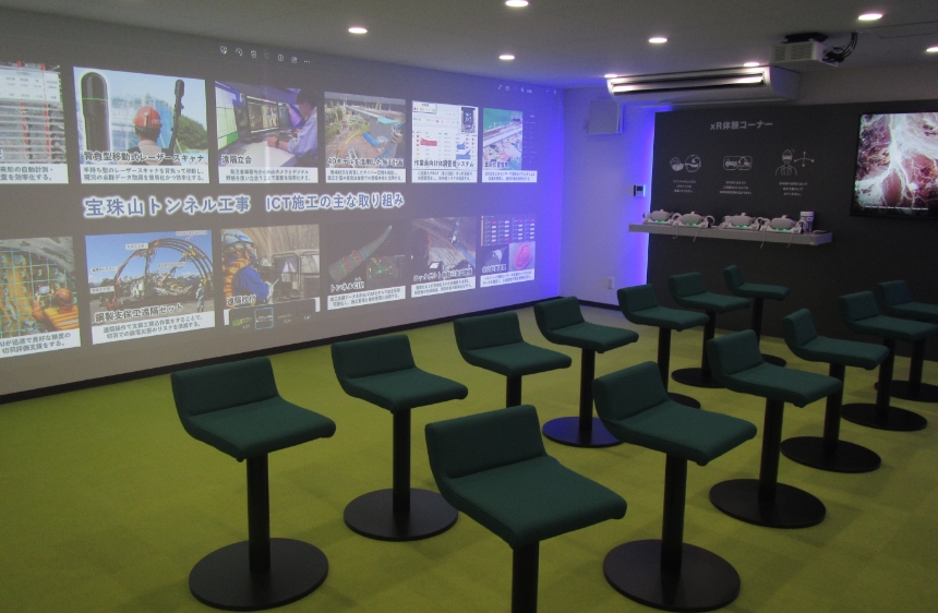 未来の建設現場を体感・想像する 「体感ルーム」。インパクトのある体験型の展示、現場にいるような臨場感で、5〜10年後の 建設現場を体感・想像・検証します。