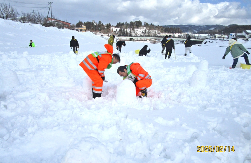横手工事事務所では、令和7年2月15日~16日に横手市内で開催された、横手の雪まつり2025へ参加をしてきました。横手の雪まつりは、小正月行事「かまくら」などが楽しめるお祭りであり、横手川周辺の蛇の崎川原では約3,500個に明かりをともしたミニかまくらが幻想的な「地上の天の川」などがあります。