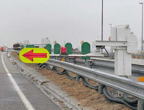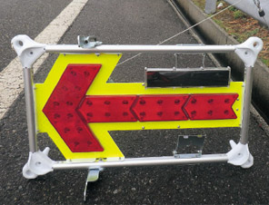 巻取式ワイヤーロープを内蔵した飛散防止機能のある矢印板です。ワイヤーロープを伸ばして防護柵等に固定して使用します。