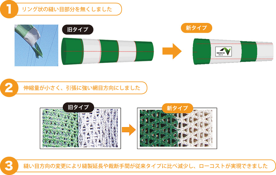 吹流しは、高速道路上でお客様に横風の危険性を直感的に伝えるローテクながら非常に有効な安全施設です。しかしながら、365日24時間風雨、氷雪に曝されることから損傷が著しく、平均で年間2~3箇所(北海道支社管内)の取替えが発生しているのが現状です。損傷は、リング状の縫い目部分がほつれるのが主でした。