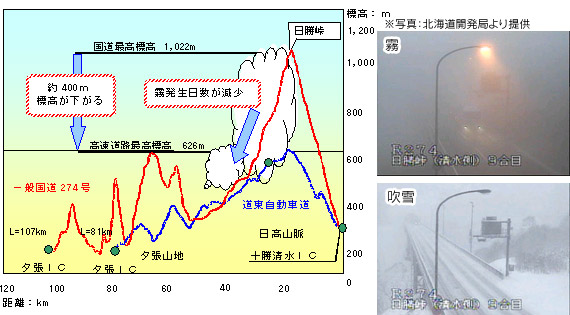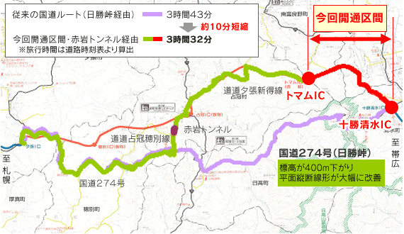 ด้วยการเปิดส่วนนี้จะสามารถเดินทางระหว่างพื้นที่ส่วนกลางและตะวันออกของฮอกไกโดได้โดยหลีกเลี่ยงเส้นทาง Nissho Pass ซึ่งมีความสูง 1,022 เมตรซึ่งเป็นเส้นทางภูเขาที่มีสภาพแวดล้อมทางธรรมชาติที่รุนแรง