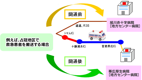 ตัวอย่างเช่นในกรณีของหมู่บ้าน Shimukappu และเมือง Minamifurano เมื่อทำการขนส่งผู้ป่วยที่มีอาการรุนแรงตามอัตภาพจะใช้เวลา 2 ชั่วโมงหรือมากกว่านั้นในการขนส่งถนนทั่วไปไปยังโรงพยาบาลใน Asahikawa ซึ่งเป็นเมืองศูนย์กลางของพื้นที่อยู่อาศัย การเปิดส่วนนี้จะสามารถโอนไปยังโรงพยาบาลในเมืองโอบิฮิโระได้ในเวลาประมาณ 1 ชั่วโมงซึ่งจะให้ การขยายตัว เป็นตัวเลือกสำหรับมาตรการช่วยชีวิตฉุกเฉินและคาดว่าโอกาสทางการแพทย์รายวันจะดีขึ้น