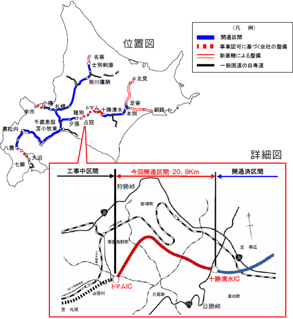 ส่วนที่จะเปิดในครั้งนี้เริ่มต้นจาก Tokachi Shimizu IC ที่เปิดไปแล้วไปสู่ทิศทางของซัปโปโรผ่านอุโมงค์หรือสะพานผ่านเกือบกลางของ Hidaka Pass และ Karikatsu Pass ของภูเขา Hidaka และที่ Tomamu IC ถนน Yubari Shin มันเป็นส่วนขยายของ 20.9km ที่เชื่อมต่อกับสายการเข้าซื้อกิจการ