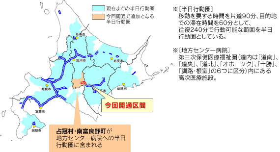 Shimukappu mura และ Minamifurano-cho ซึ่งไม่ได้รวมอยู่ในช่วงครึ่งวันของการดำเนินการโรงพยาบาลศูนย์ภูมิภาคจะรวมอยู่ในช่วงครึ่งวันเนื่องจากการเดินทางสั้นลงสู่เมืองโอบิฮิโระเนื่องจากการเปิดส่วนนี้ โดยการลดระยะเวลาการขนส่งไปยังสถานพยาบาลต่อไปเราจะมีส่วนร่วมในการรักษาพยาบาลในท้องถิ่น