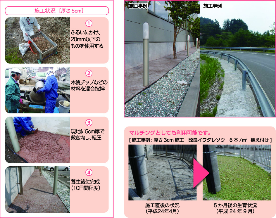 防腐処理をした木質系チップを固化剤で練り混ぜ、敷きならすことにより、高い防草効果を発揮するマルチング工法です。