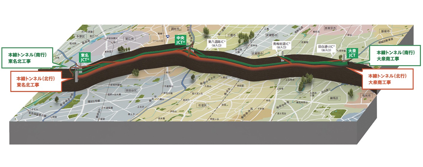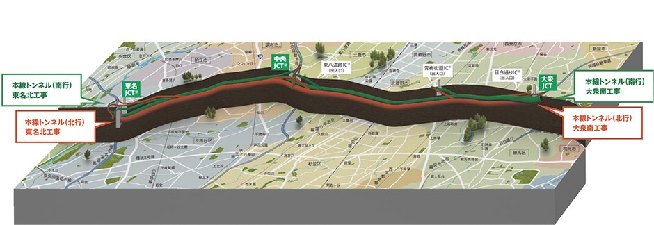 その外環道は現在、関越道から東名高速をつなぐ東京区間の約16kmの事業を国土交通省、東日本高速道路㈱、中日本高速道路㈱が共同して進めています。