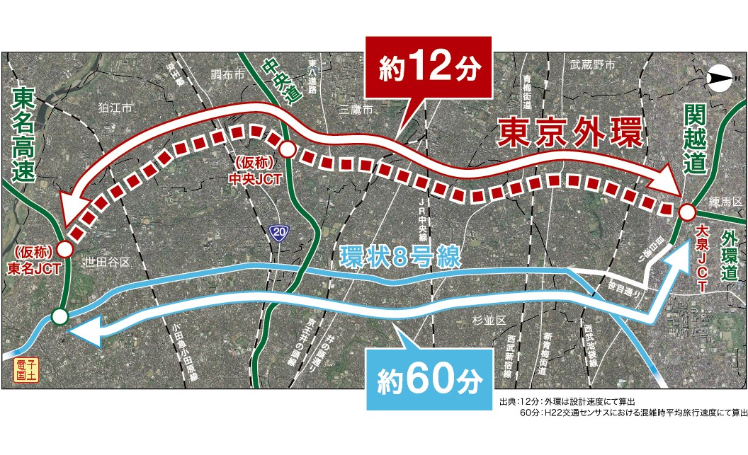 東京外かく環状道路は、都心から約15kmの圏域を環状に連絡する延長約85kmの道路であり、首都圏の渋滞緩和、環境改善や円滑な交通ネットワークを実現する上で重要な道路です。