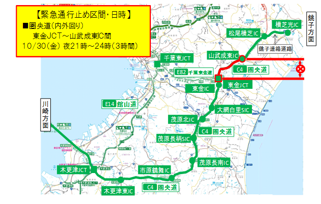 NEXCO东日本在市原管理处(千叶县市原市)C4首都圏中央連絡自動車道(以下称为“圏央道”)Togane交界处(以下称为“ JCT”)与山武清藤(以下称为“ JCT”)在Sanbunaruto交汇处(以下简称“ IC”),由于事故恢复工作,紧急夜间通行将被关闭。