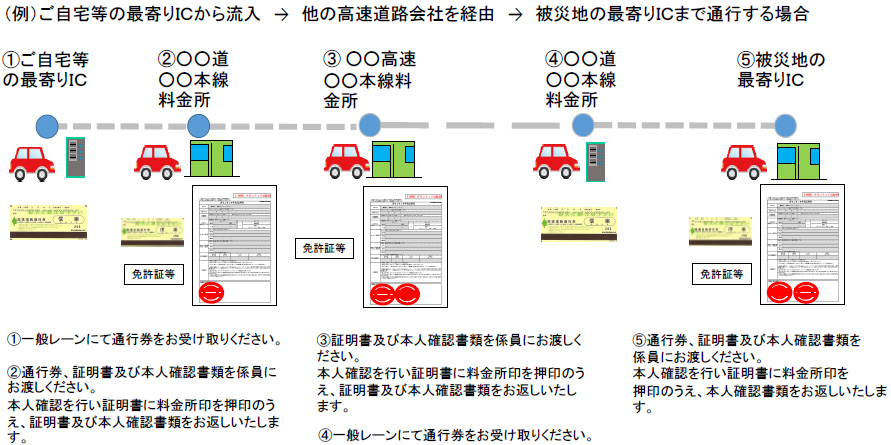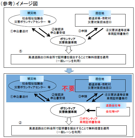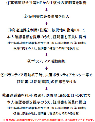 - 【1】高速道路の無料措置を受けるためのボランティアセンターへの事前手続きが不要となります。