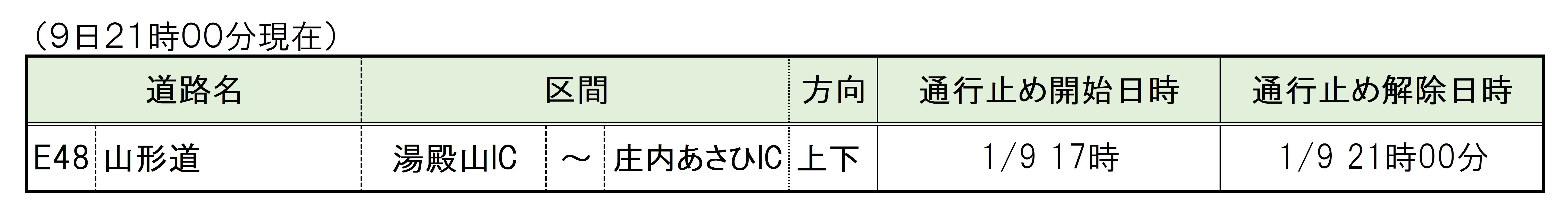 1月9日(木)17時より実施していた大雪に伴う通行止めについて、以下のとおり21時00分をもってすべて解除となりました。長時間、ご不便・ご迷惑をおかけしましたことをお詫び申し上げます。