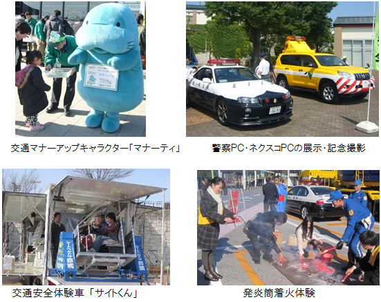 分发交通安全宣传单张和货物 巡逻车/白色摩托车展示和纪念照 事故和掉落物体的照片,掉落物体的展品,交通安全体验车“ Site-kun” |