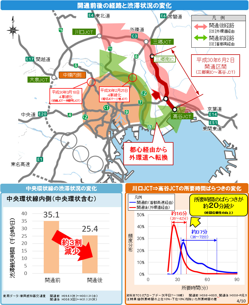 - 从川口JCT⇒高谷JCT从市区到外环线的变化将所需时间的变化减少了约20分钟,并提高了时间可靠性。