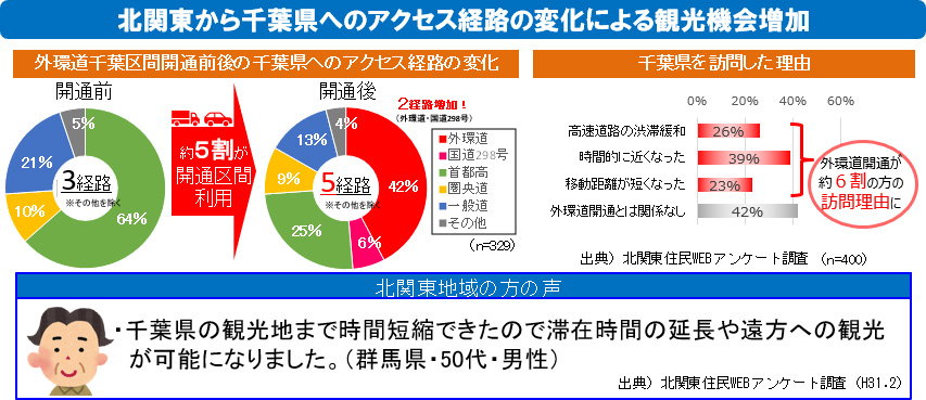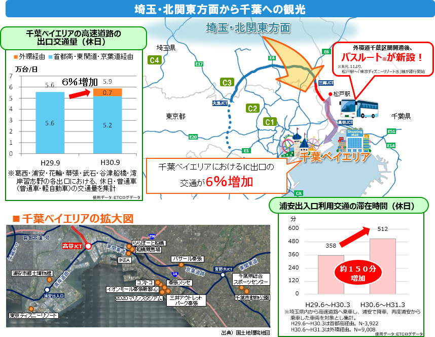 - 外环路千叶段的开放将使千叶湾地区(幕张,浦安,葛西临海公园等)的高速公路出境交通量(假期)增加6%,从而增加了来自Sa玉和关东北部地区的旅游机会。贡献(H29.9→H30.9)。