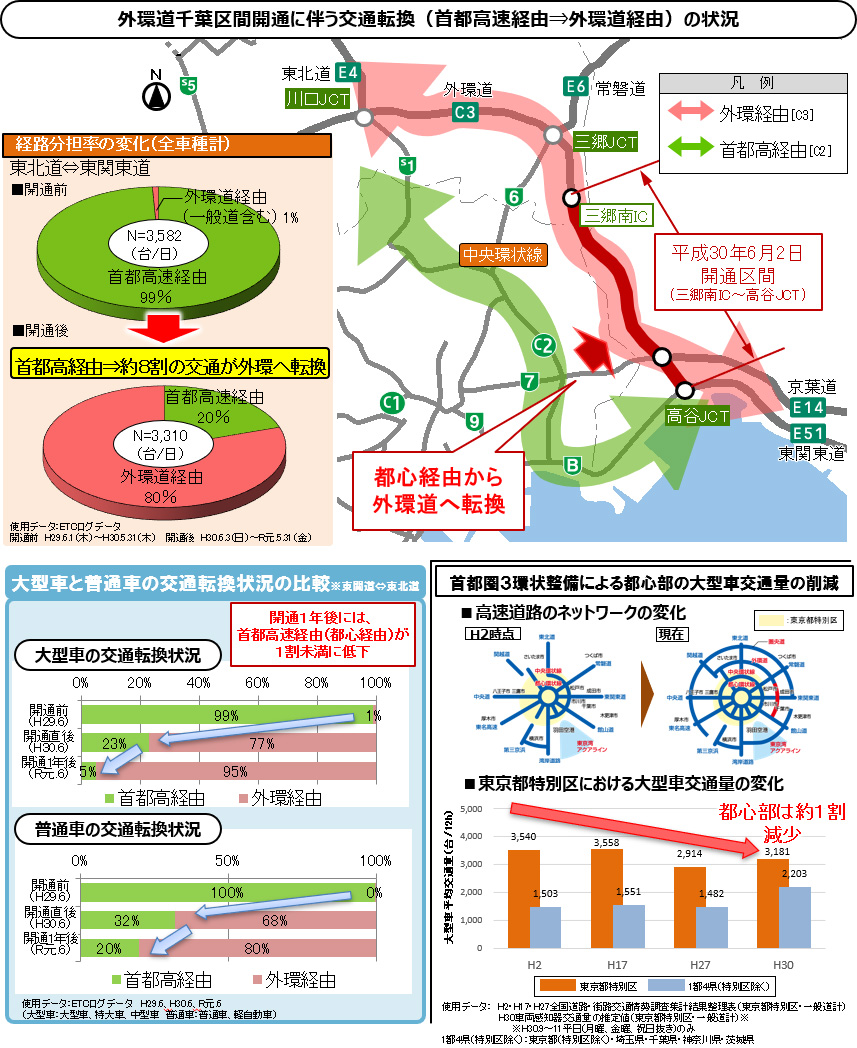 - 在Sa玉和千叶之间(東北道↔东关东高速公路)之间行驶时,大型车辆在开通后立即通过外环路继续增加,开通后一年(R1.6)不到通关高速公路的约10%。下降到。