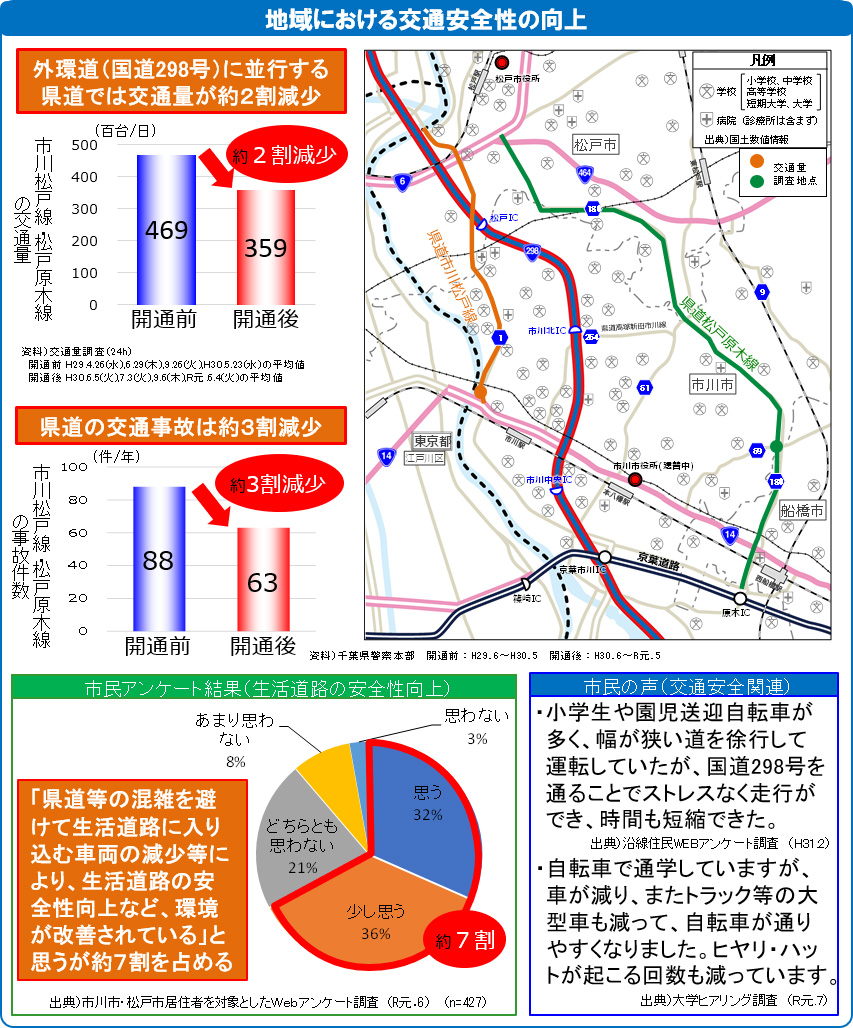 - 与外环路(298国道)平行的主要道路(市川松户线和松堂巴拉基线)的交通事故减少了约30%,不仅改善了汽车,而且改善了行人和自行车。