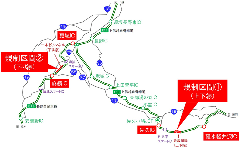 - 由于行驶车道和路肩变窄,行驶时请遵守规定速度,确保车距,充分注意追尾事故等。另外,在管制区间的前后会切换很大的车道,所以请按照当地的指示牌等通行。