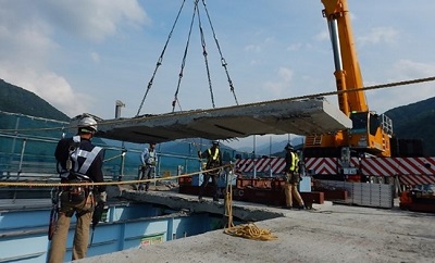 床版取替工事とは、老朽化や大型車の増加などにより傷んだコンクリート床版をより耐久性の高い新しいプレストレストコンクリート床版に取替える工事です。また、コンクリート床版の劣化を防ぐために防水層に高性能な床版防水も施工します。