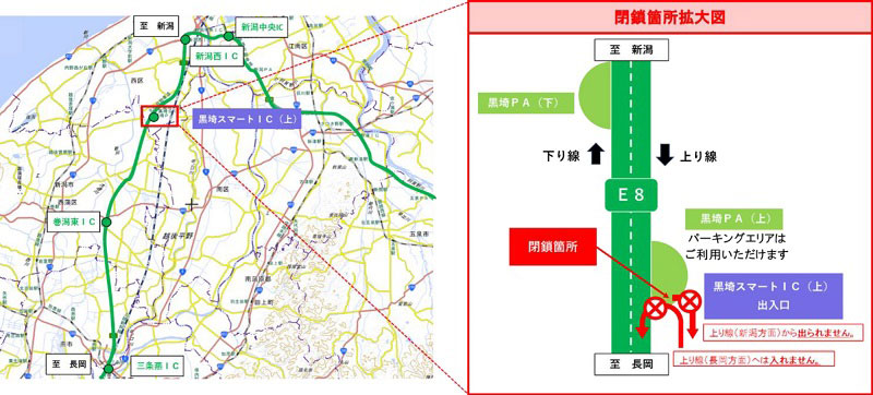 根据日期为 2020 年 1 月 18 日(星期三)的新闻稿,从 3 月 25 日(星期六)起,在E8北陸自動車道黑崎黑崎智能立交桥(IC),所有车型将 24 小时开放。由于运营变更,黑崎智能 IC 入站出入口(新泻出口和长冈入口)将因施工关闭。