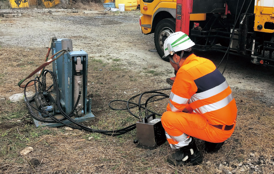 更换防护栏作业时,将人力进行的支柱拔出机械化了。