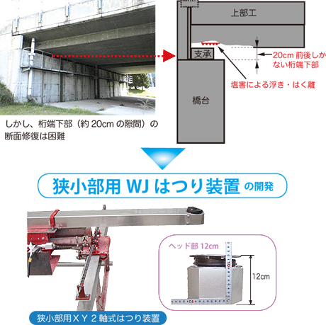 1. 最小12cmの狭小部にもぐり込みウォータージェット工法WJ(R)による橋梁上部工桁端狭小部のコンクリートはつりを可能としました。