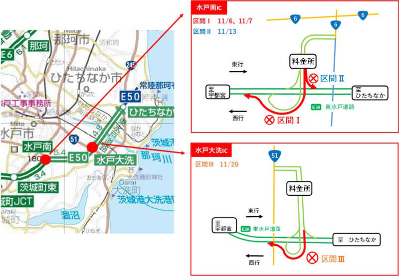 由於路面受損,東水戸道路各IC將進行路面修復工程。由於施工工作無法在正常車道限制下進行,因此有必要關閉匝道。