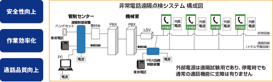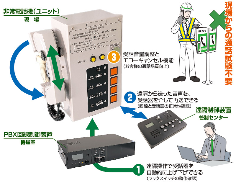 (株)ネクスコ東日本エンジニアリング現場に⾏かずに管制センターから⾮常電話の受話器と回線も含めた通話の正常性確認と、お客さまへのサービス向上ができます。狭小路肩や積雪地帯など点検が困難な場所への導入が効果的です!
